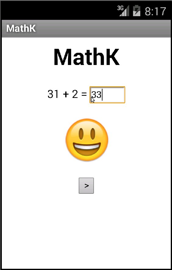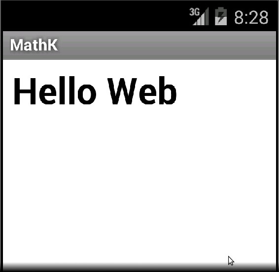 At this point we know that our Android Development environment is up and running as expected. It is time to start coding. The main code for our program is located in the file MathK/src/com/papermint_designs/mathk/MathK.java Sure all that path was created by the android create project command we issued early. What we are going to do is to use a WebView control in our Android application, or in other words, we are going to build a web browser able to run our Web application!. For that we have to modify MathK.java to look like this:
