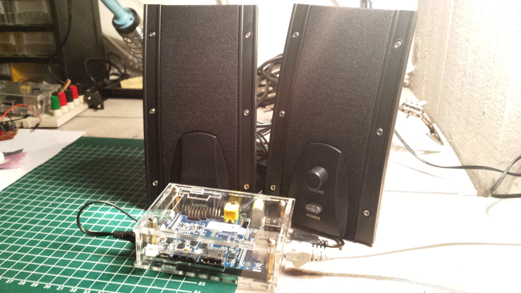 Since I recorded the video, I have upgraded a bit the setup with new speakers and a box for the Bpi. This is a picture of the current system... that I'm currently using to be warn when long tasks finish (i.e. downloads, calculations, ...).