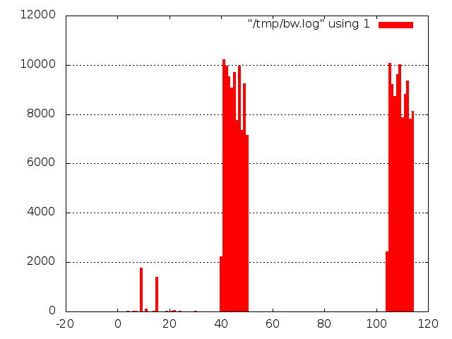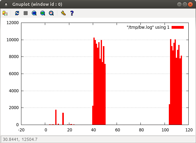Now that we have the data in the text file we can easily produce a plot using gnuplot. Just launch gnuplot and type:gnuplot> set grid ytics lc rgb "#000" lw 1 lt 0 gnuplot> set style fill solid gnuplot> set boxwidth 0.8 gnuplot> plot "filename" using 1 with boxesThis will plot a nice bar graph showing the bandwidth usage. Changing using 1 to using 2, will show the outgoing bandwidth plot... Yep, we are retrieving both figures. The plot below shows a sample of the output for the script. You can see some web browsing after circa 10 seconds since monitoring started, and then two big transfers (actually that is the download of the linux kernel) one around 40 secs and another one aroung 105 secs.