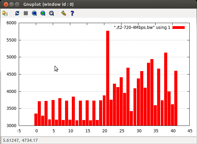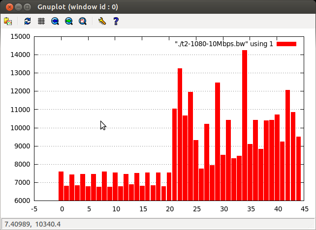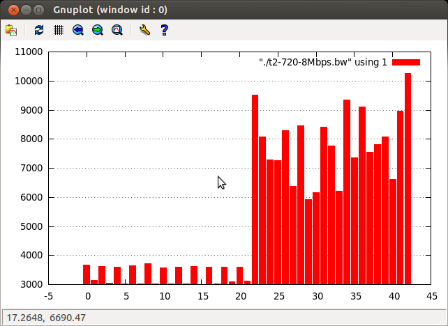 Min : 3009.310000 Max : 10255.040000 Average : 5543.662326The average is below the requested 8 Mbps. However the bandwidth peaks actually doubles the required bandwidth. The bandwidth plot shows that again a similar shape.