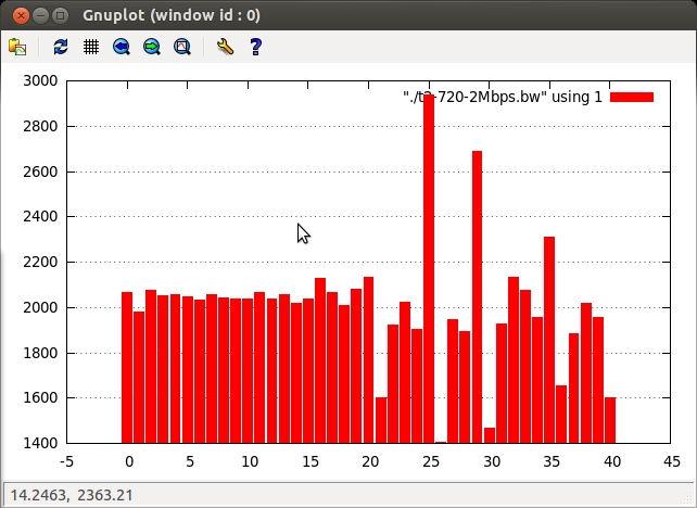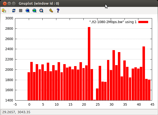 Min : 1409.230000 Max : 2827.400000 Average : 2035.182000The average bandwidth is pretty much the one required. The peak is close to 50% more than the requested bandwidth. The plot is very similar to the one we got with 5Mbps. In this case, the video quality is poor, specially when something changes in the image. No variations on the frame rate.