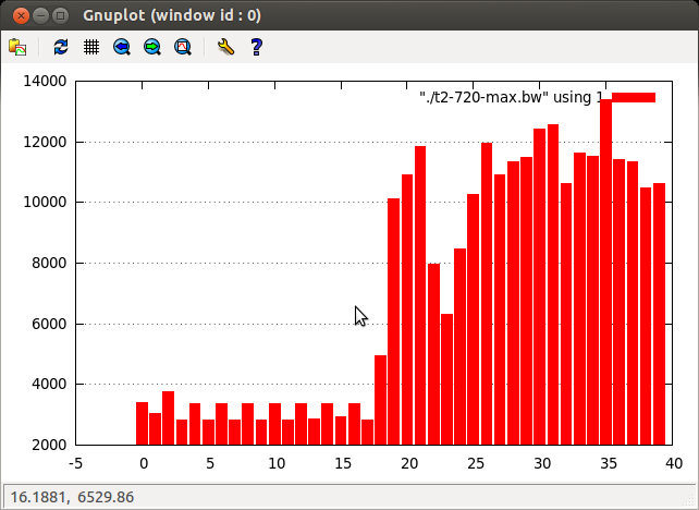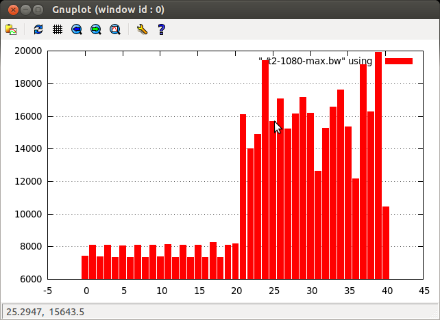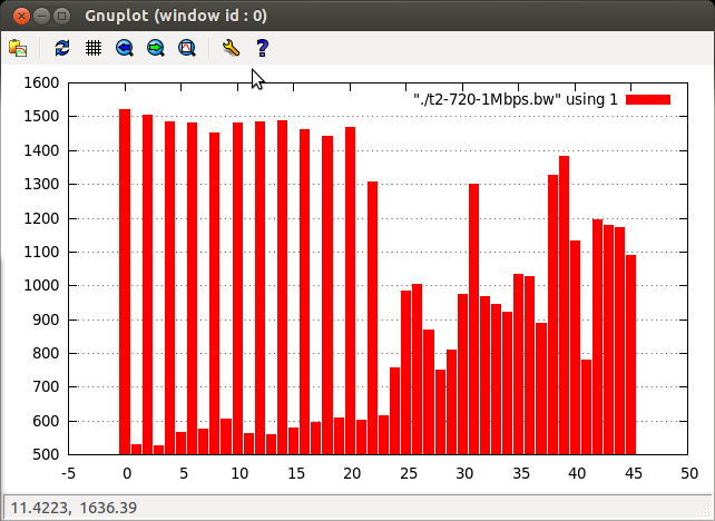 Min : 525.790000 Max : 1520.210000 Average : 1021.731739We can see the usual 50% extra bandwidth peak. However the plot in this case is curious: