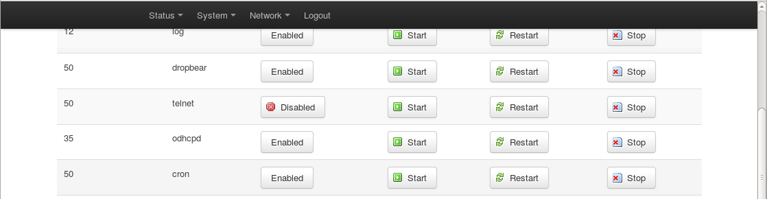 Como hemos dicho, en este artículo, vamos a suponer que el router está ejecutando algún tipo de Firmware abierto (DD-WRT u OpenWrt van perfectos com ya os hemos dicho). La razón es que, necesitamos poder habilitar el acceso al intérprete de comandos en el router, lo que no siempre es posible con los firmwares originales instalados en los routers. Al menos, sin liarla parda. Tanto DD-WRT como OpenWrt nos proporcionan un cómodo interfaz gráfico para configurar los servicios que queremos ejecutar en nuestro router. Lo que vamos a hacer es activar el servidor ssh para poder acceder al router desde la línea de comandos. Podéis encontrar los detalles de como hacer esto en las webs de los respectivos firmwares. En general, solo hay que pulsar un botón en un panel que debería llamarse "Services" o algo así. Aquí tenéis una captura del panel de control de OpenWrt en nuestro router, para haceros una idea, y otra de un DD-WRT.