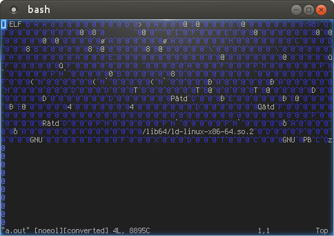 - Ahora tenéis que convertir el fichero en binario de nuevo. Activad modo comando y escribid : ":%!xxd -r"