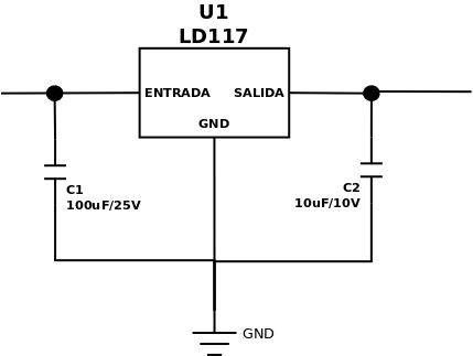 De acuerdo con el datasheet deberíamos usar 100uF en la entrada y 10uF en la salida. Estos son valores típicos que funcionan bien. No vamos a explicar ahora el porque de estos valores ni la necesidad de añadir estos condensadores. Simplemente, por el momento, quedaros con la idea de que van a hacer que nuestro voltaje sea más estable, y que, en general, es una buena práctica seguir las recomendaciones del datasheet... suelen estar ahí para ayudar.