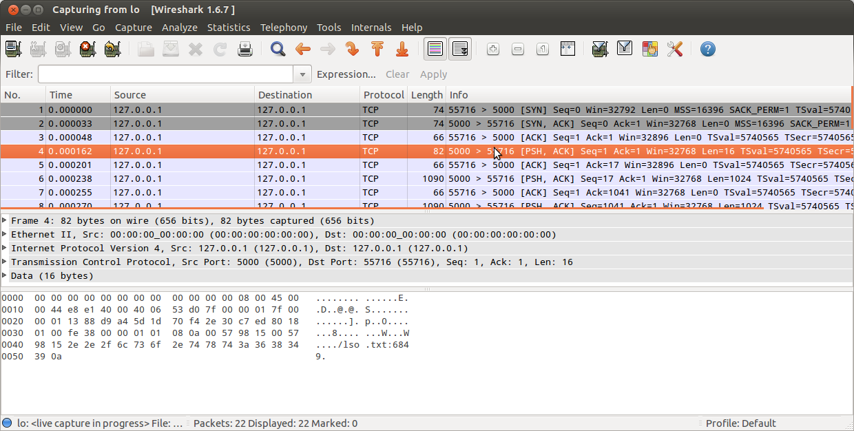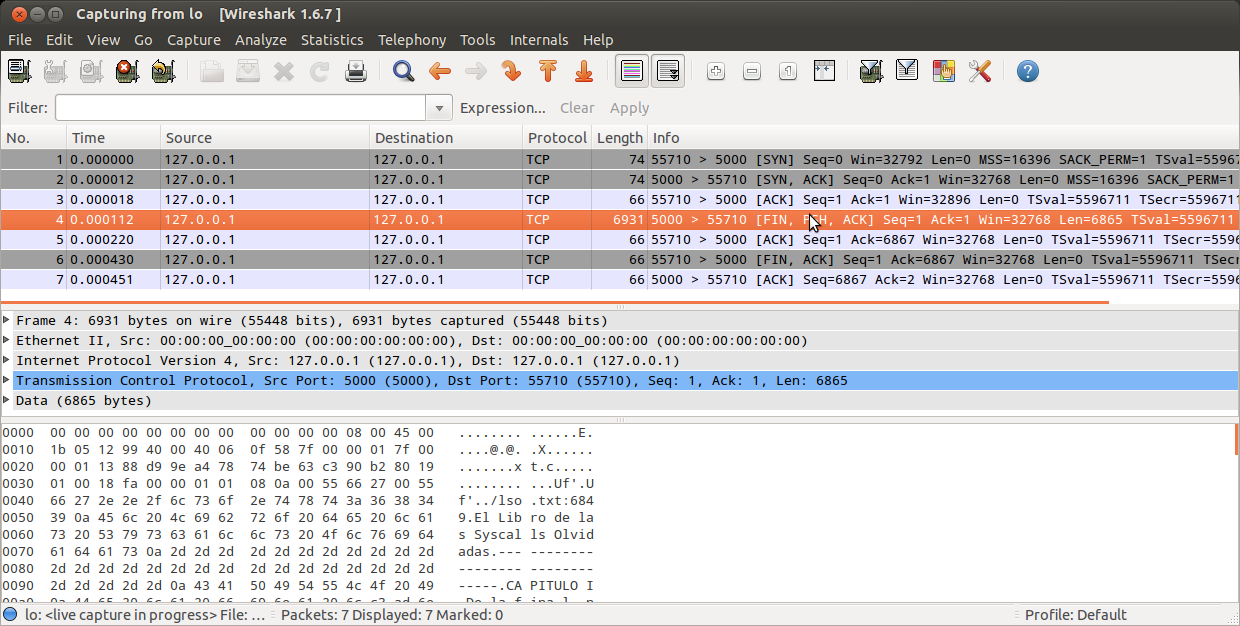 Bien, ahora podemos lanzar wireshark (o el sniffer que más rabia os dé) y veamos que es lo que se envia por la red. Para nuestra prueba, en un terminal lanzaremos nuestro terminal, pasándole como parámetro un fichero de texto. En otro terminal nos conectaremos con netcat de forma que podamos ver fácilmente el resultado (de ahí lo del fichero de texto).