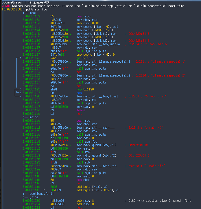 A partir de este punto podéis aplicar distintas técnicas de ofuscación para hacer más complicado averiguar que es lo que hace el programa. Por mi parte voy a insertar una serie de saltos al final de la función justo antes del código de las funciones especiales, para que parezca que el código real nunca se ejecuta… si bien esto es algo muy sencillo de ver cuando se hace un análisis dinámico.