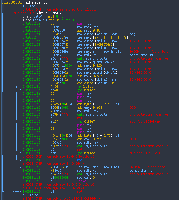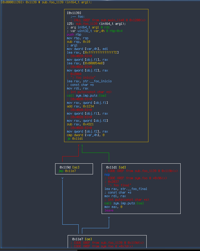 La otra forma que la gente usa para ver al código es el modo gráfico, popularizado por la herramienta IDA Pro y que nos permite, de un vistazo, ver la estructura general del programa de forma gráfica. radare2 ofrece esta vista en modo texto, pero podéis usar alguno de los GUIs para interactuar con el para verlo en modo gráfico. Para nuestro ejemplo, esta vista mostraría lo siguiente: